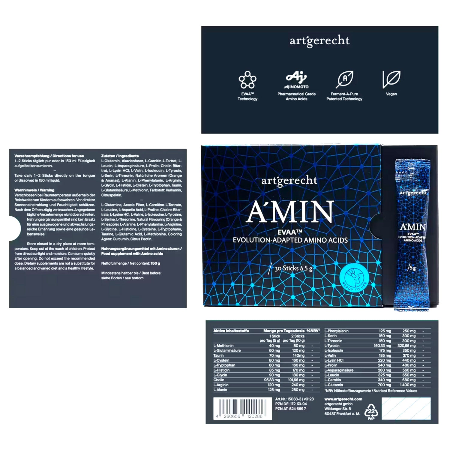 Der patentierte EVAA™-Mix enthält alle essentiellen und nicht-essentiellen Aminosäuren in freier Form, wodurch sie direkt über die Mundschleimhaut aufgenommen werden können. Das sorgt für eine besonders schnelle Bereitstellung und hohe Bioverfügbarkeit. Mit einem Reinheitsgrad von über 99 % ist AMIN optimal verwertbar und unterstützt die Bildung von Proteinen, Zellen, Hormonen und Enzymen.