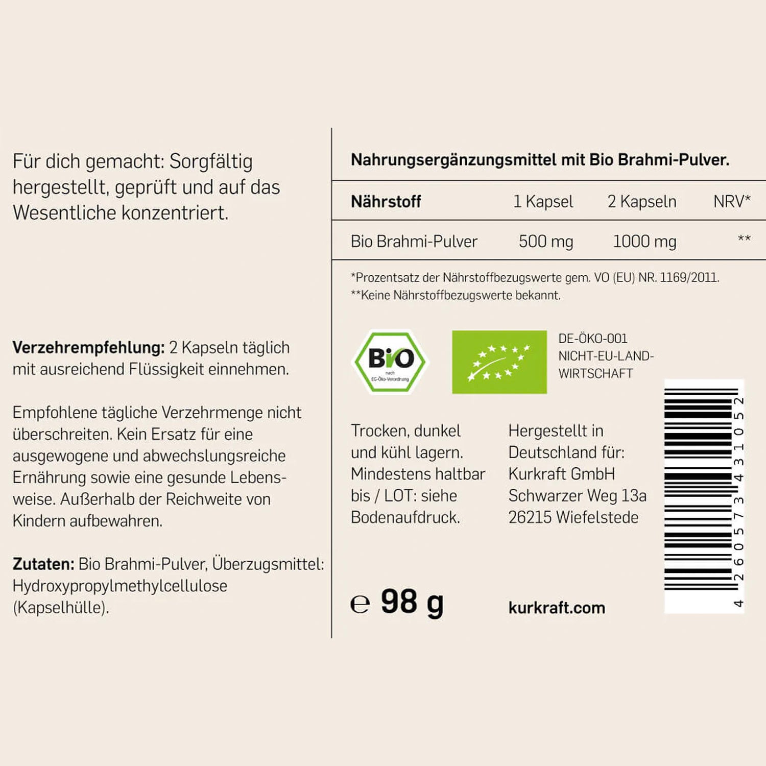 Kurkraft BIO BRAHMI liefert reines, schonend getrocknetes Pulver aus kontrolliert biologischem Anbau in Indien. Die Kapseln bieten eine natürliche Unterstützung für alle, die Körper und Geist in Einklang bringen und geistige Leistungsfähigkeit auf natürliche Weise fördern möchten.