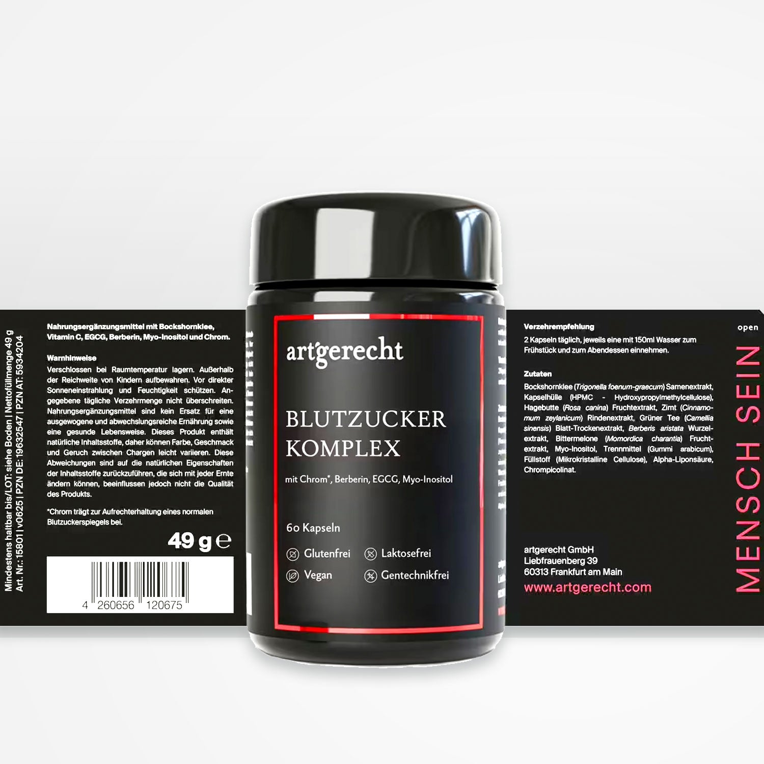 Der Blutzucker Komplex von art’gerecht ist eine innovative Kombination aus sorgfältig ausgewählten Pflanzenextrakten, essenziellen Mikronährstoffen und bioaktiven Substanzen, die dazu beitragen, den Blutzuckerspiegel im normalen Bereich zu halten und den Stoffwechsel zu unterstützen.
