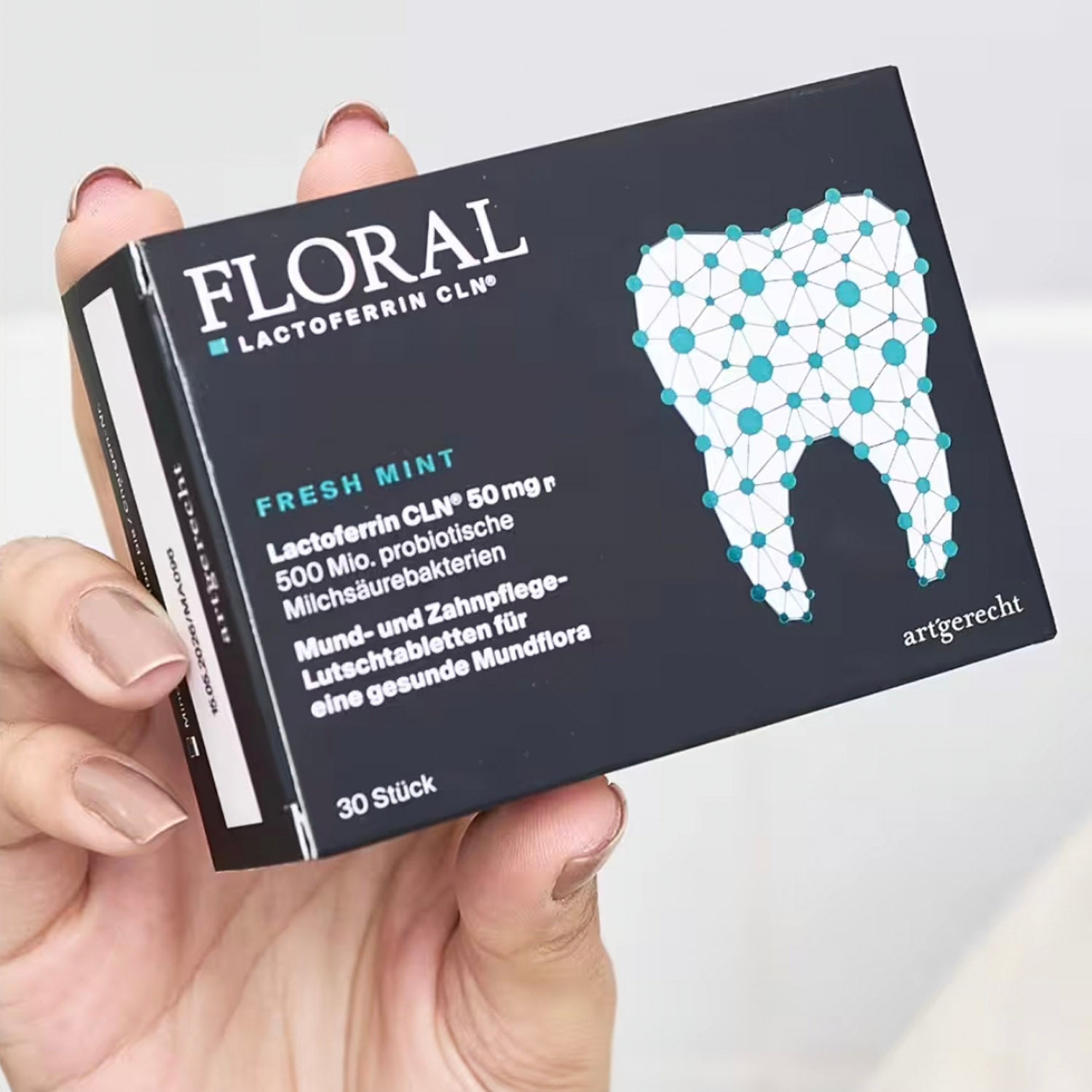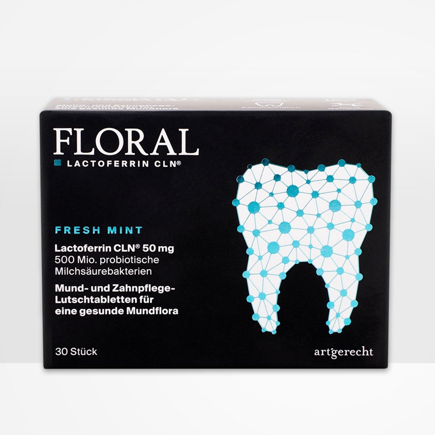 FLORAL von art‘gerecht ist eine innovative Kombination aus probiotischen Milchsäurebakterien und hochreinem Lactoferrin CLN®, entwickelt zur Förderung einer gesunden Mundflora und zur natürlichen Unterstützung der Zahngesundheit. Die speziell formulierten Lutschtabletten tragen dazu bei, das bakterielle Gleichgewicht im Mundraum wiederherzustellen, schädliche Keime zu reduzieren und Zähne sowie Zahnfleisch zu schützen.