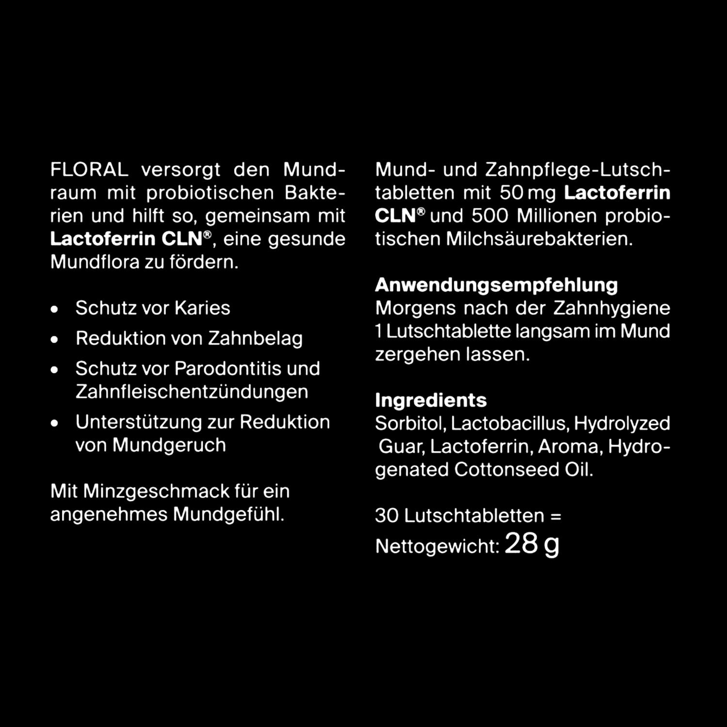 FLORAL sind formulierte Lutschtabletten mit probiotischen Milchsäurebakterien und hochaufgereinigtem Lactoferrin CLN®, die speziell für die Mund- und Zahngesundheit entwickelt wurden. Sie unterstützen das bakterielle Gleichgewicht im Mundraum und tragen zu einer gesunden Mundflora bei.