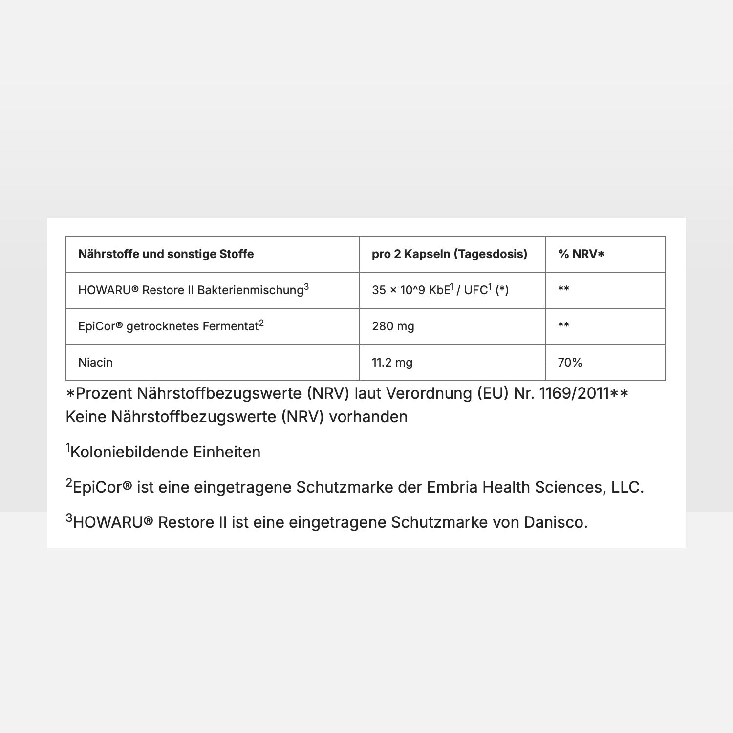 Feuchthaltemittel: Glycerol; Hydroxypropylmethylcellulose (pflanzliche Kapselhülle), 15 % EpiCor® getrocknetes Fermentat¹ (Saccharomyces cerevisiae), Fructooligosaccharide, HOWARU® Restore II Bakterienmischung² (Lactobacillus acidophilus NCFM®, Lactobacillus paracasei Lpc-37TM, Bifidobacterium lactis Bi-07TM, Bifidobacterium lactis Bl-04TM), Wasser, Niacin, Trennmittel: Siliziumdioxid; Geliermittel: Gellan-Gummi; Farbstoff: Eisenoxid.