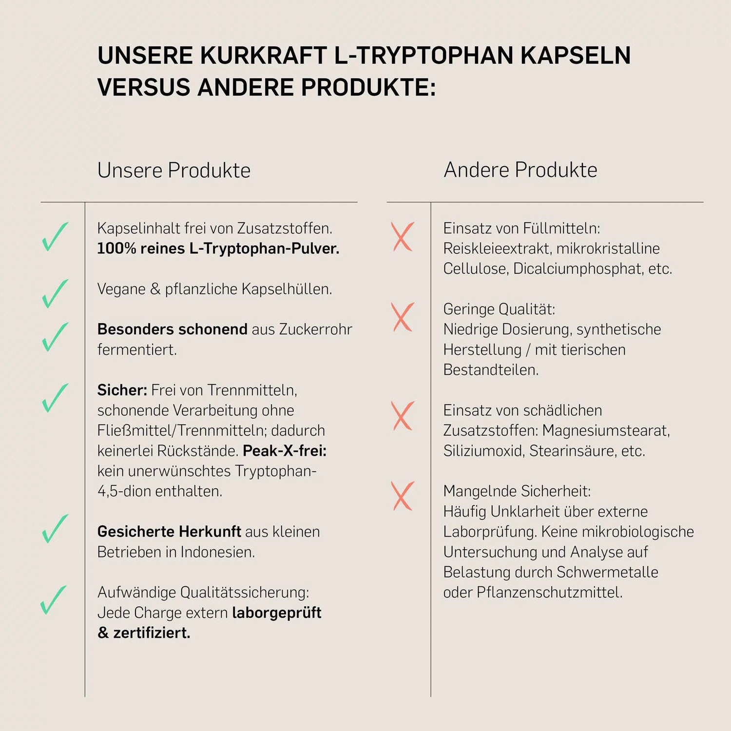 Die KURKRAFT L-Tryptophan Kapseln liefern die essentielle Aminosäure in reiner, vegan fermentierter Form – perfekt, um Körper und Geist in Balance zu bringen. L-Tryptophan ist die natürliche Vorstufe von Serotonin und Melatonin und kann so zur Unterstützung von Stimmung, Entspannung und Schlaf beitragen.