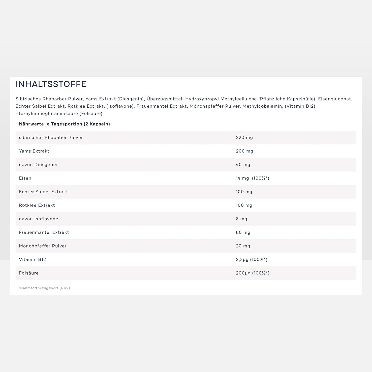 Sibirisches Rhabarber Pulver, Yams Extrakt (Diosgenin), Überzugsmittel: Hydroxypropyl Methylcellulose (Pflanzliche Kapselhülle), Eisengluconat, Echter Salbei Extrakt, Rotklee Extrakt, (Isoflavone), Frauenmantel Extrakt, Mönchspfeffer Pulver, Methylcobalamin, (Vitamin B12), Pteroylmonoglutaminsäure (Folsäure).