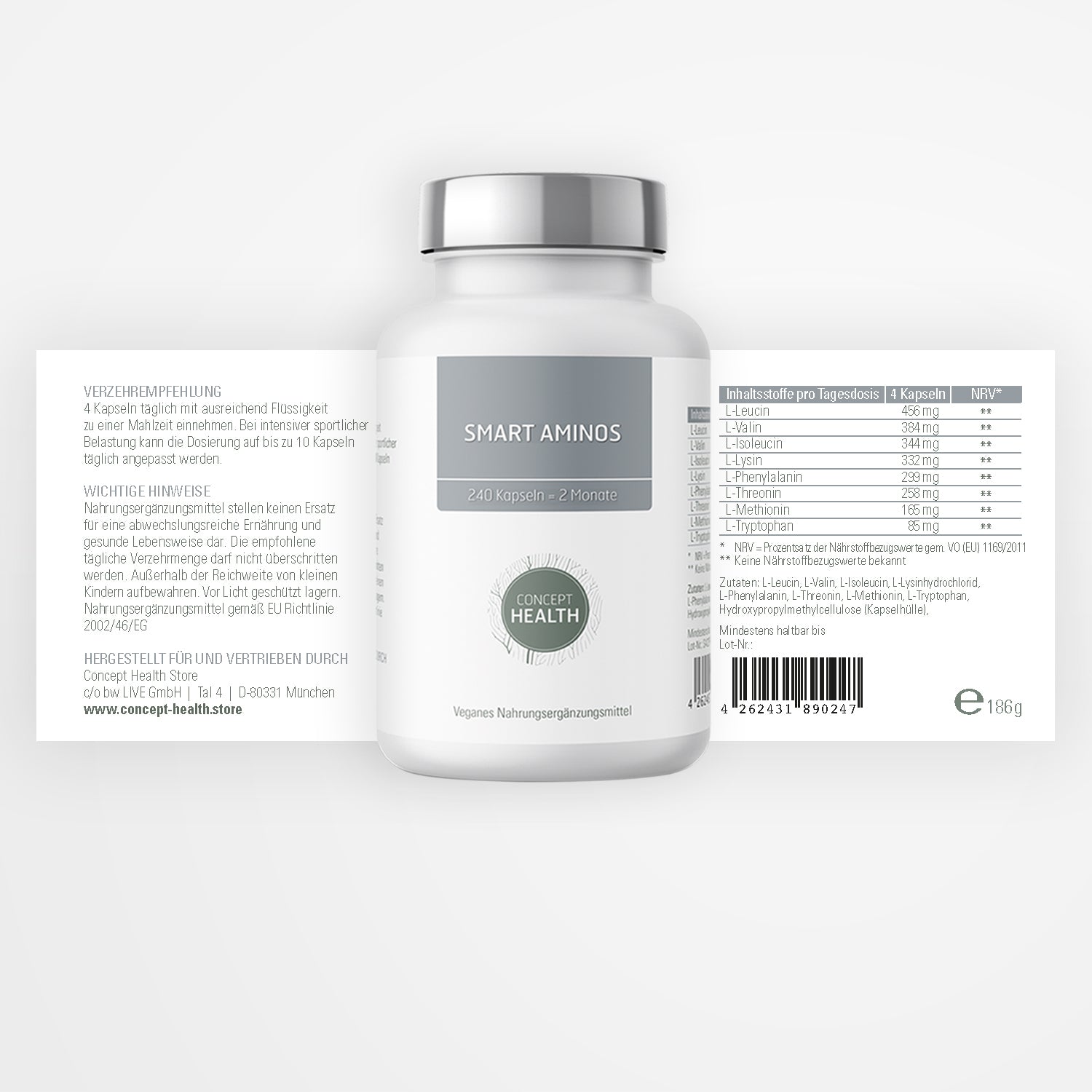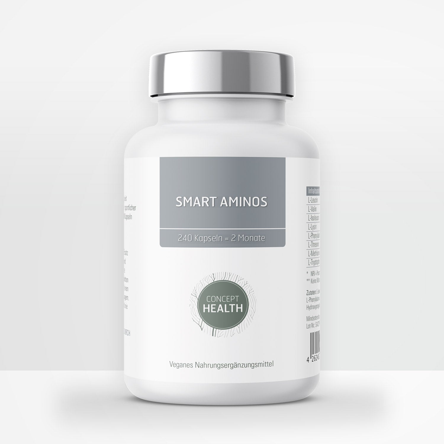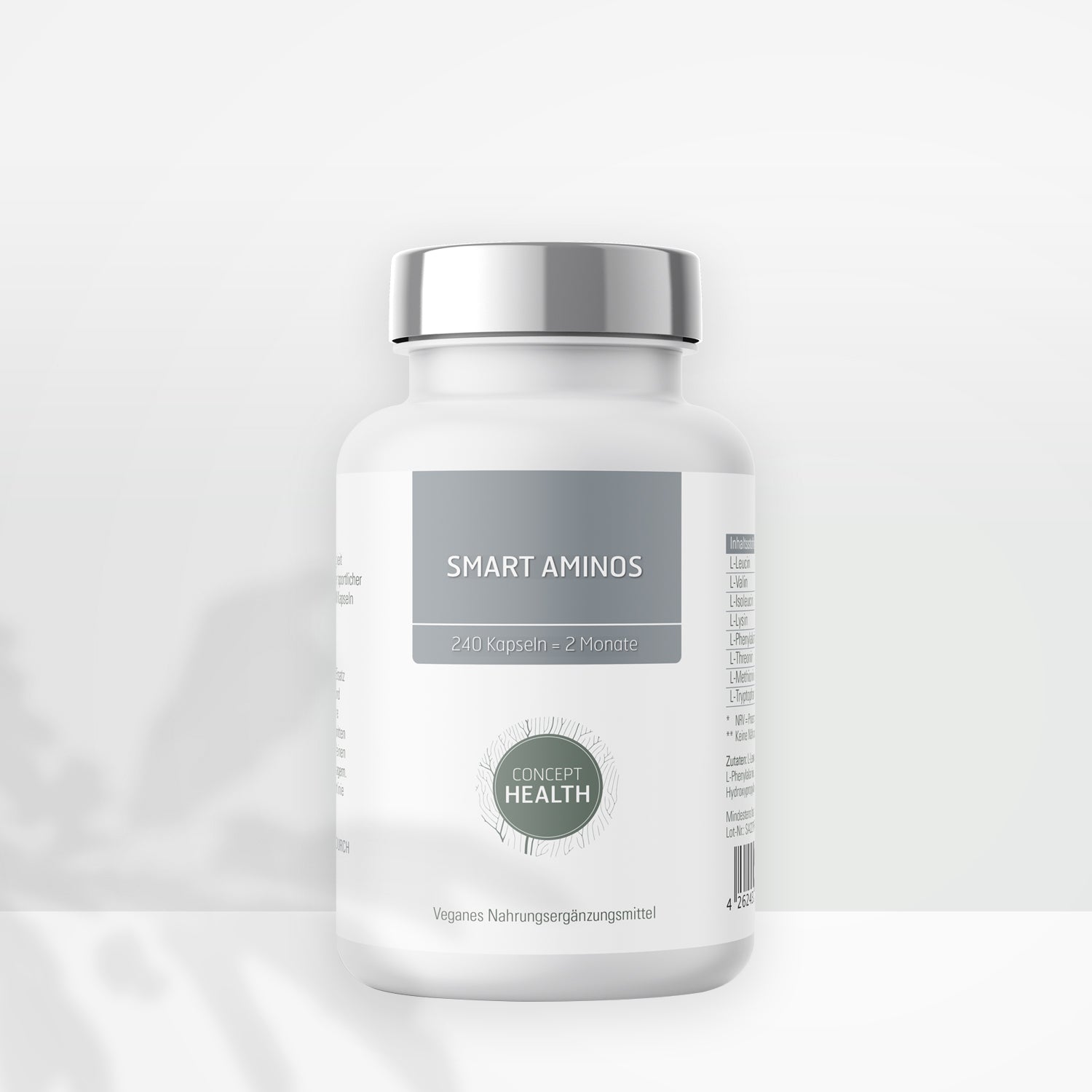 Smart Aminos von CONCEPT HEALTH liefert einen gezielt formulierten Aminosäurekomplex mit freien essenziellen Aminosäuren — also Aminosäuren, die dein Körper nicht selbst produzieren kann und daher zugeführt werden müssen. Diese einzigartige „Master Amino Pattern“-Formel stellt ca. 15 g Protein pro Portion (4 Kapseln) bereit, fördert den Muskelaufbau, beschleunigt die Regeneration nach Belastung und unterstützt die Struktur von Muskeln und Knochen. Dank freier Aminosäuren erfolgt die Aufnahme effizient und schonend – ideal bei sportlicher Aktivität, hoher Beanspruchung oder gezieltem Aufbau-Training.