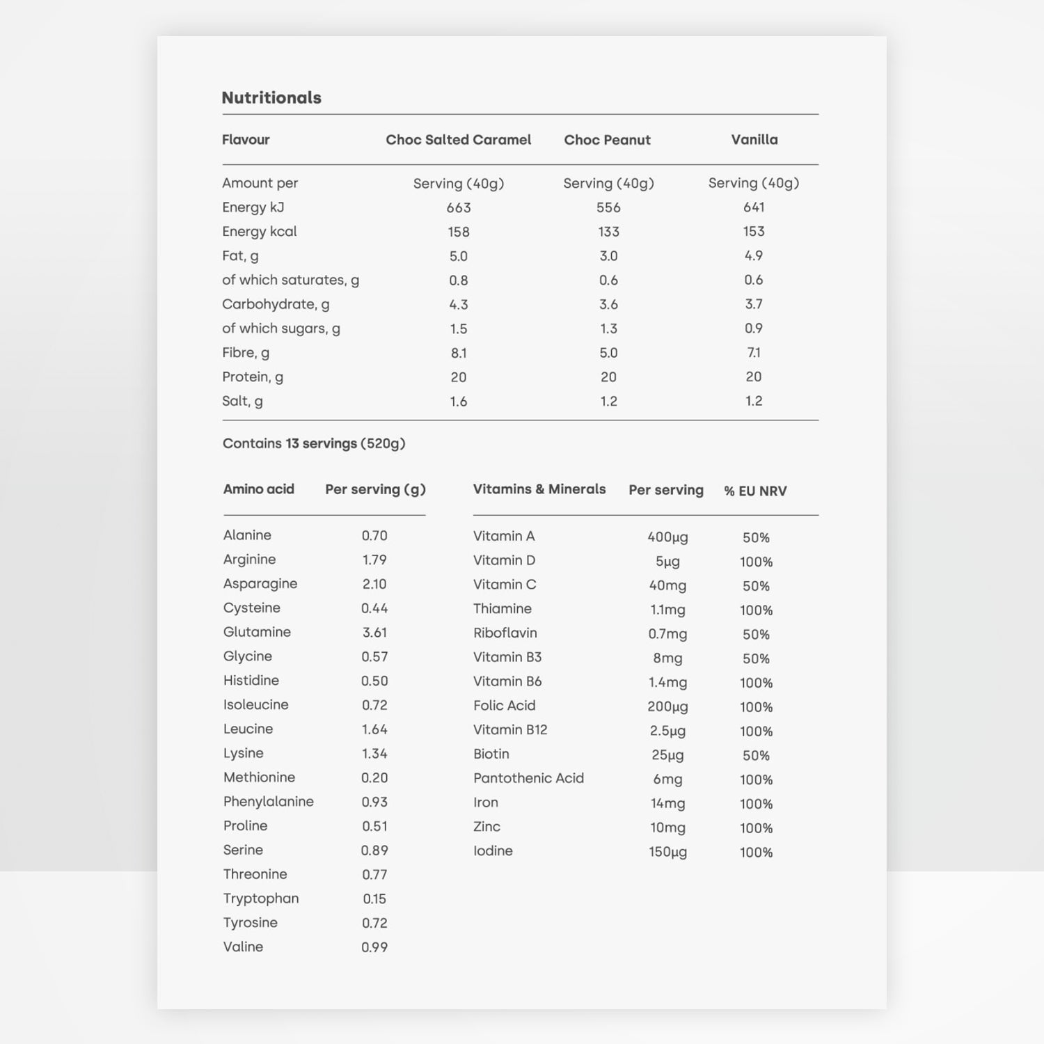 Bio-Erbsenproteinisolat, gemahlenes Leinsamenpulver, fettreduziertes Kakaopulver (7%), Inulin, natürliches Aroma, Maca-Pulver, Kürbiskernprotein, Naturreisprotein, Spirulina, Brokkolipulver, Grünkohl, Rote-Bete-Pulver, Karottenpulver, Kohlpulver, Meersalz, Spinatpulver, Alfalfapulver, Kelp, Orangenfruchtpulver, Digezyme® (Amylase, Protease, Laktase, Lipase, Cellulase), Blaubeerfruchtpulver, Himbeerfruchtpulver, Acaibeerenpulver, Süßungsmittel (Stevia, Thaumatin), Eisen, Vitamin C, Zink, Niacin, Pantothensäure, BioPerine® (Schwarzer Pfefferextrakt), Vitamin A, Vitamin B6, Thiamin, Riboflavin, Folsäure, Vitamin B12, Jod, Vitamin D3, Biotin.