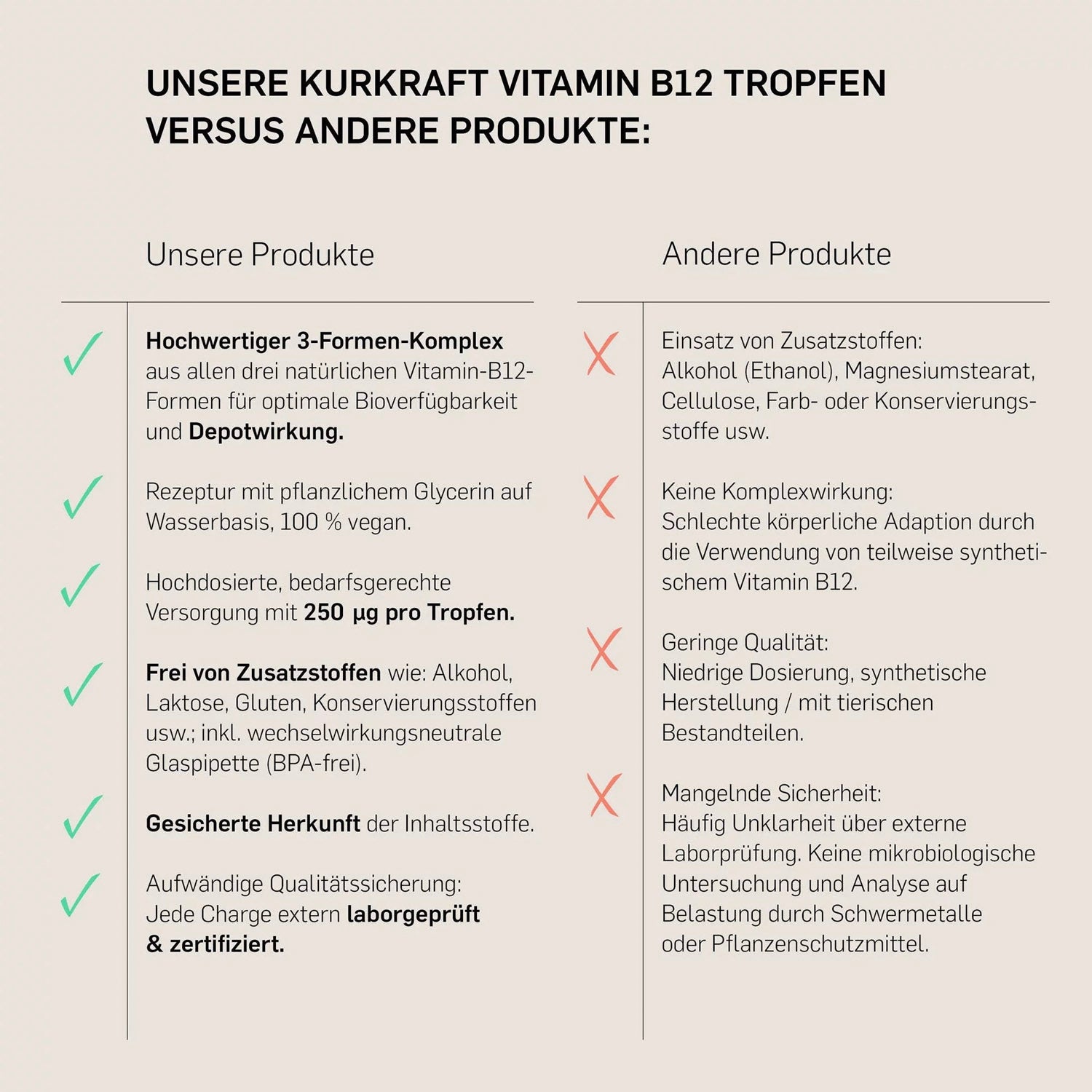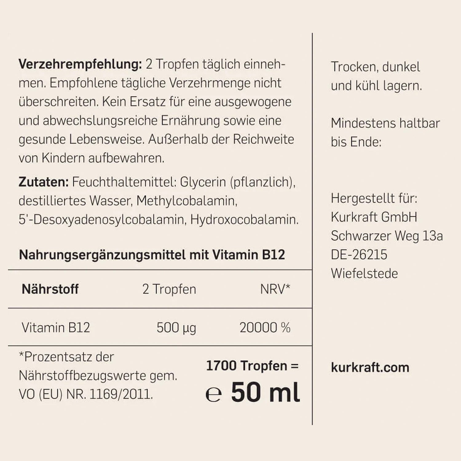 Die Kurkraft Vitamin B12 Tropfen werden in Deutschland unter pharmazeutischen Standards hergestellt. Die Rezeptur ist rein pflanzlich, frei von Ethanol, künstlichen Zusatzstoffen, Gluten, Laktose und Gentechnik.