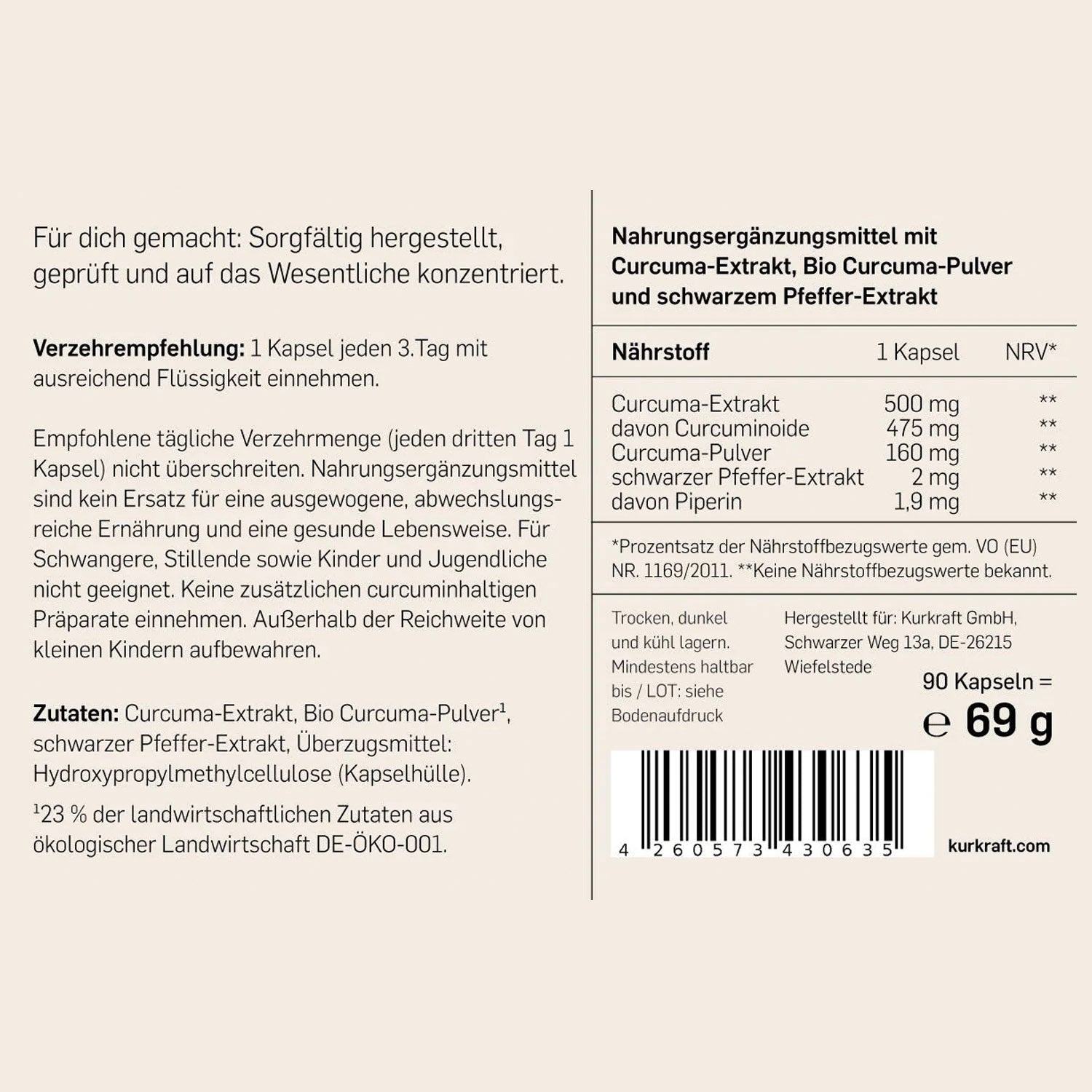 Curcuma-Extrakt, Bio Curcuma-Pulver, Schwarzer Pfeffer-Extrakt, Hydroxypropylmethylcellulose (pflanzliche Kapselhülle)
