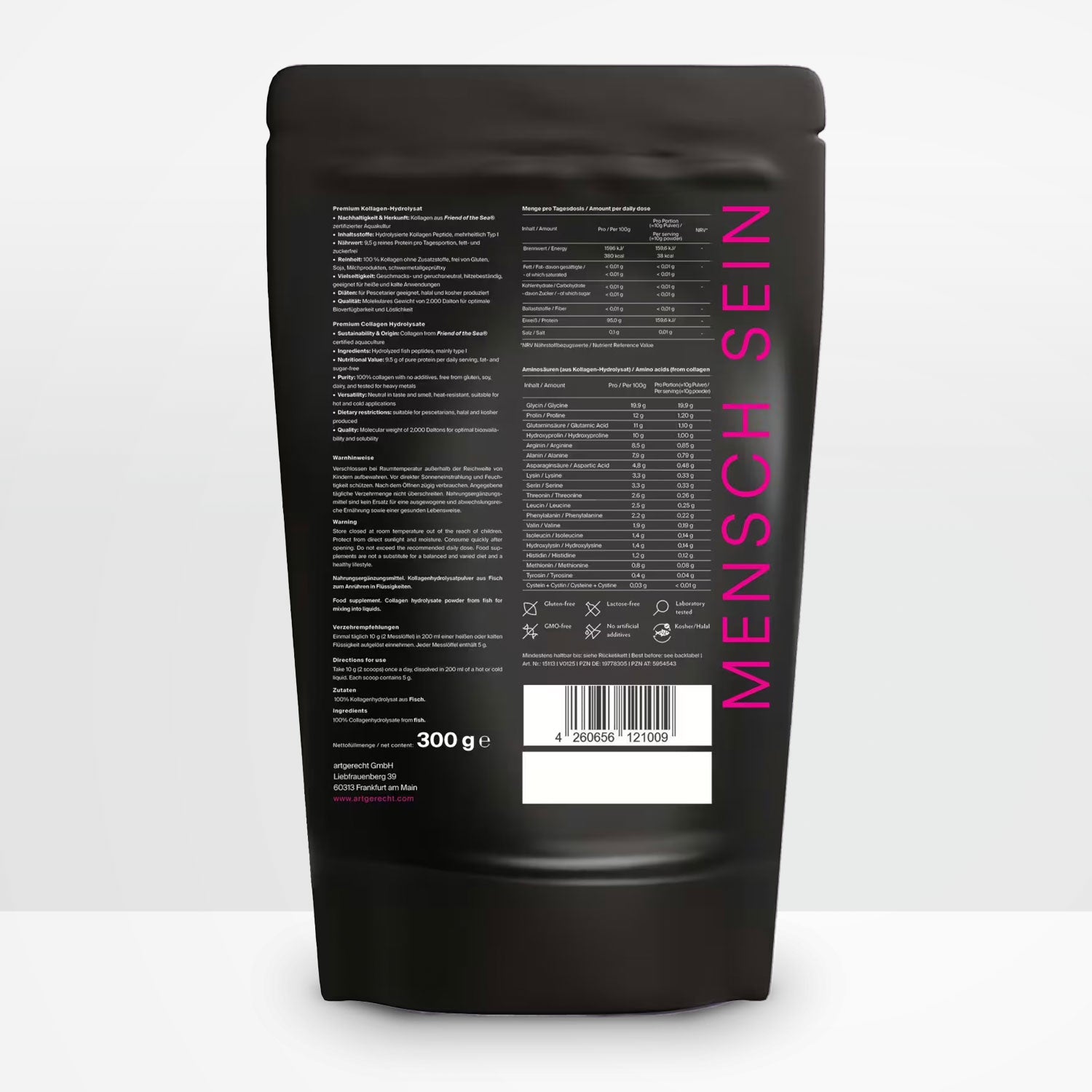 KOLLAGEN von art’gerecht ist ein hochreines, hydrolysiertes Premium-Fischkollagen mit optimaler Bioverfügbarkeit. Es unterstützt gezielt die Gesundheit von Knochen, Gelenken, Muskeln und Haut – und trägt so entscheidend zu Beweglichkeit, Elastizität und Vitalität bei.