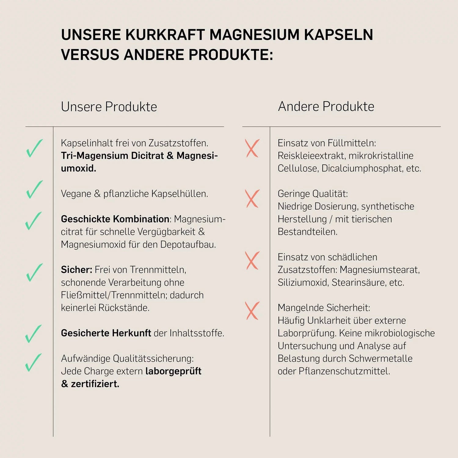 Der Kurkraft Magnesium Komplex vereint zwei hochwertige Magnesiumverbindungen – organisches Tri-Magnesium-Dicitrat und anorganisches Magnesiumoxid – für eine optimale Aufnahme und nachhaltige Versorgung.