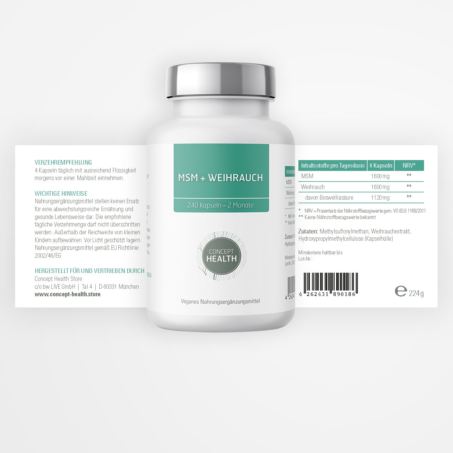 - 400 mg MSM + 400 mg Weihrauchextrakt pro Kapsel