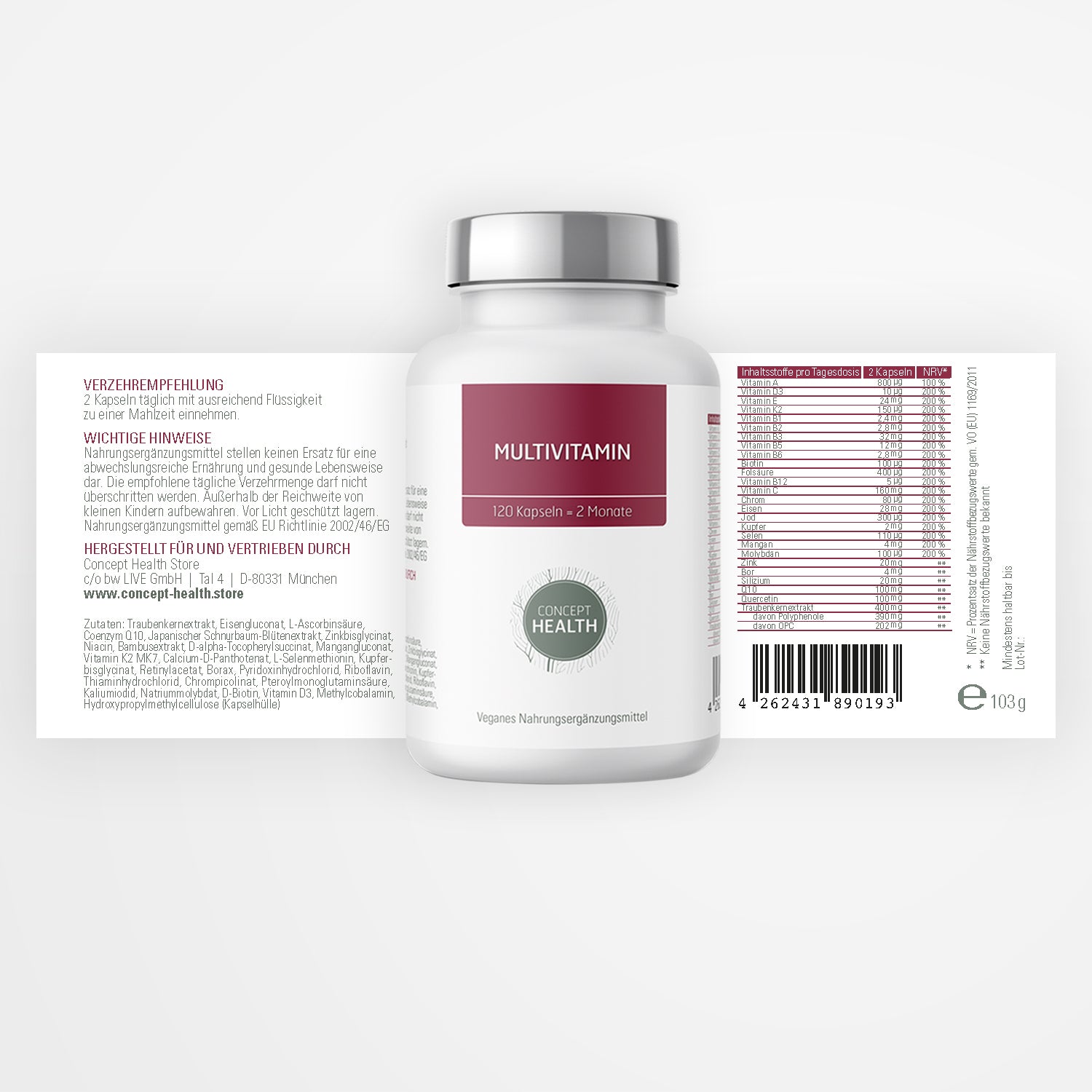 Der CONCEPT HEALTH Multivitamin-Komplex wirkt, indem er den Körper mit einer Kombination essenzieller Vitamine und Mineralstoffe versorgt, die an einer Vielzahl von Stoffwechselprozessen beteiligt sind. Vitamine fungieren dabei unter anderem als Co-Faktoren von Enzymen, als Antioxidantien oder als Regulatoren von Wachstum, Regeneration und Immunantwort.