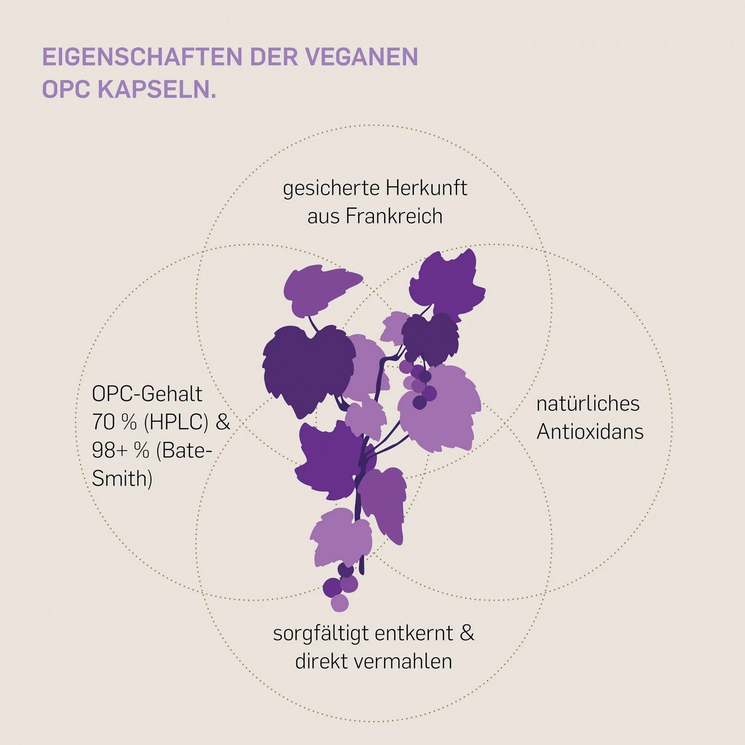 OPC steht für Oligomere Proanthocyanidine – natürliche Pflanzenstoffe aus Traubenkernen, die zur Gruppe der Flavonoide gehören. Sie kommen auch in Beeren, Äpfeln, Kakao oder Pinienrinde vor und dienen den Pflanzen als Schutz vor UV-Strahlung und Umwelteinflüssen.