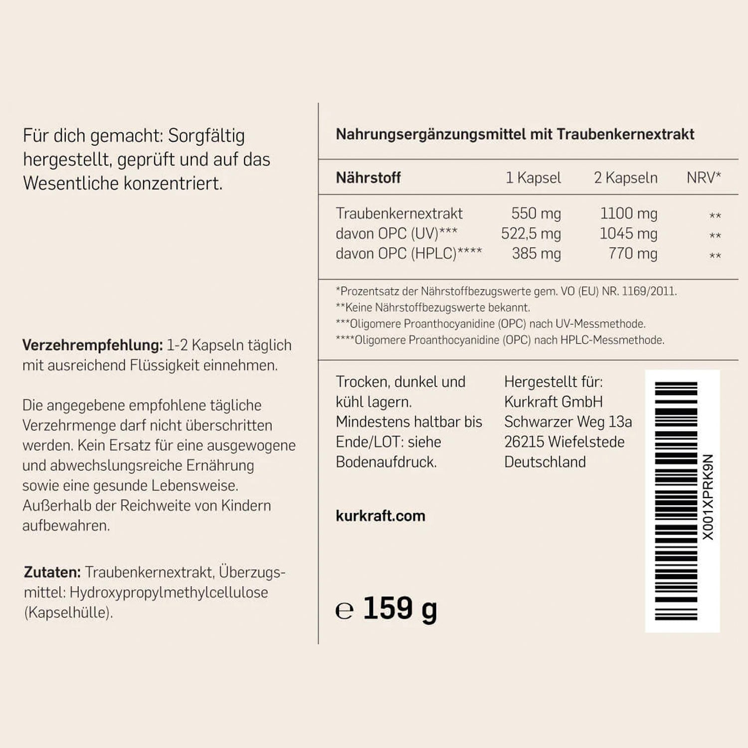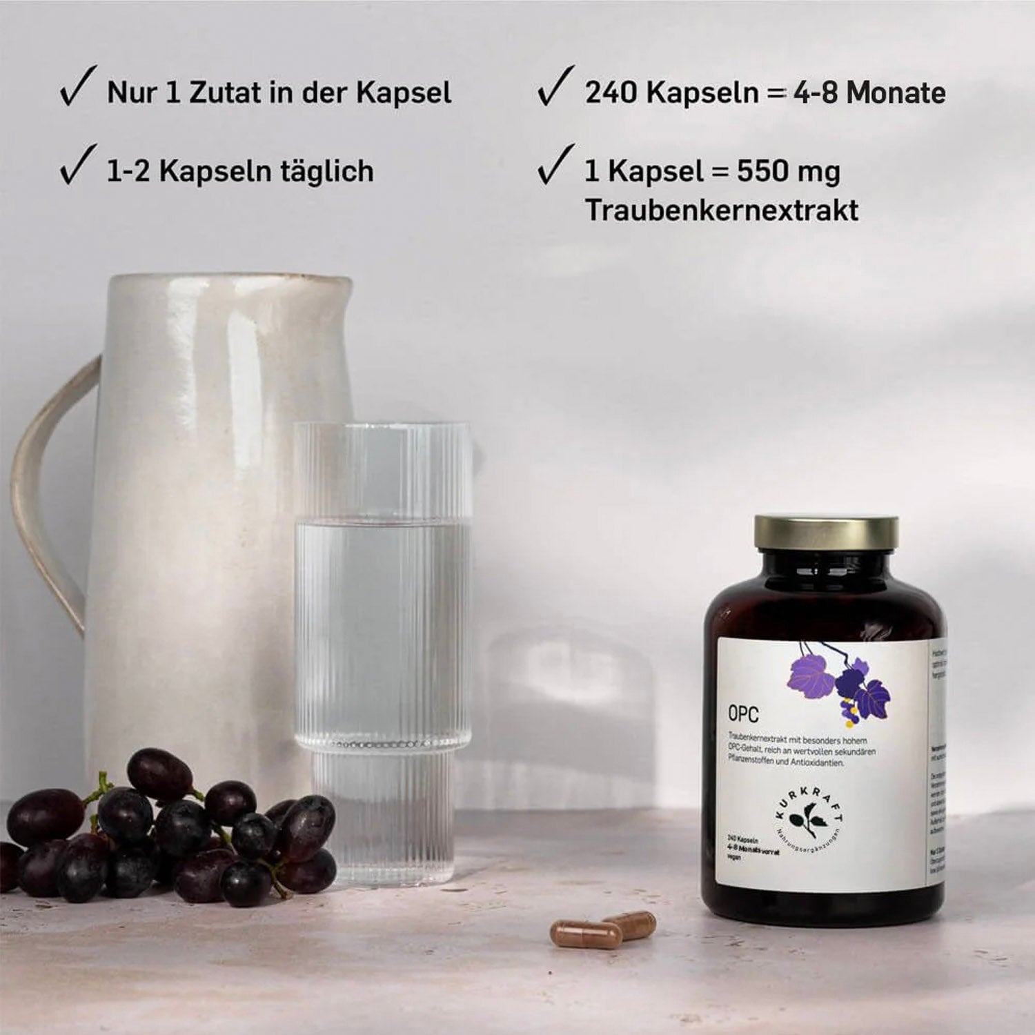 Die Kurkraft OPC Kapseln enthalten hochkonzentriertes Traubenkernextrakt mit einem besonders hohen Anteil oligomerer Proanthocyanidine (OPC) – kraftvolle sekundäre Pflanzenstoffe, die als eines der stärksten natürlichen Antioxidantien gelten.