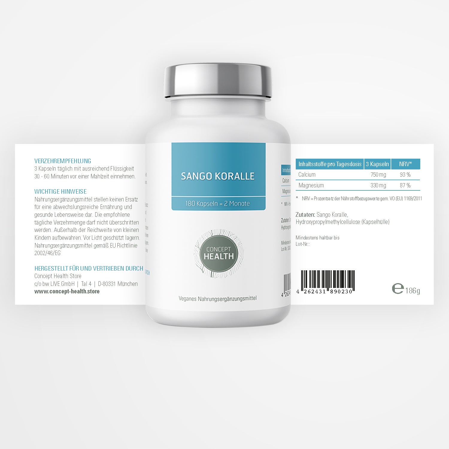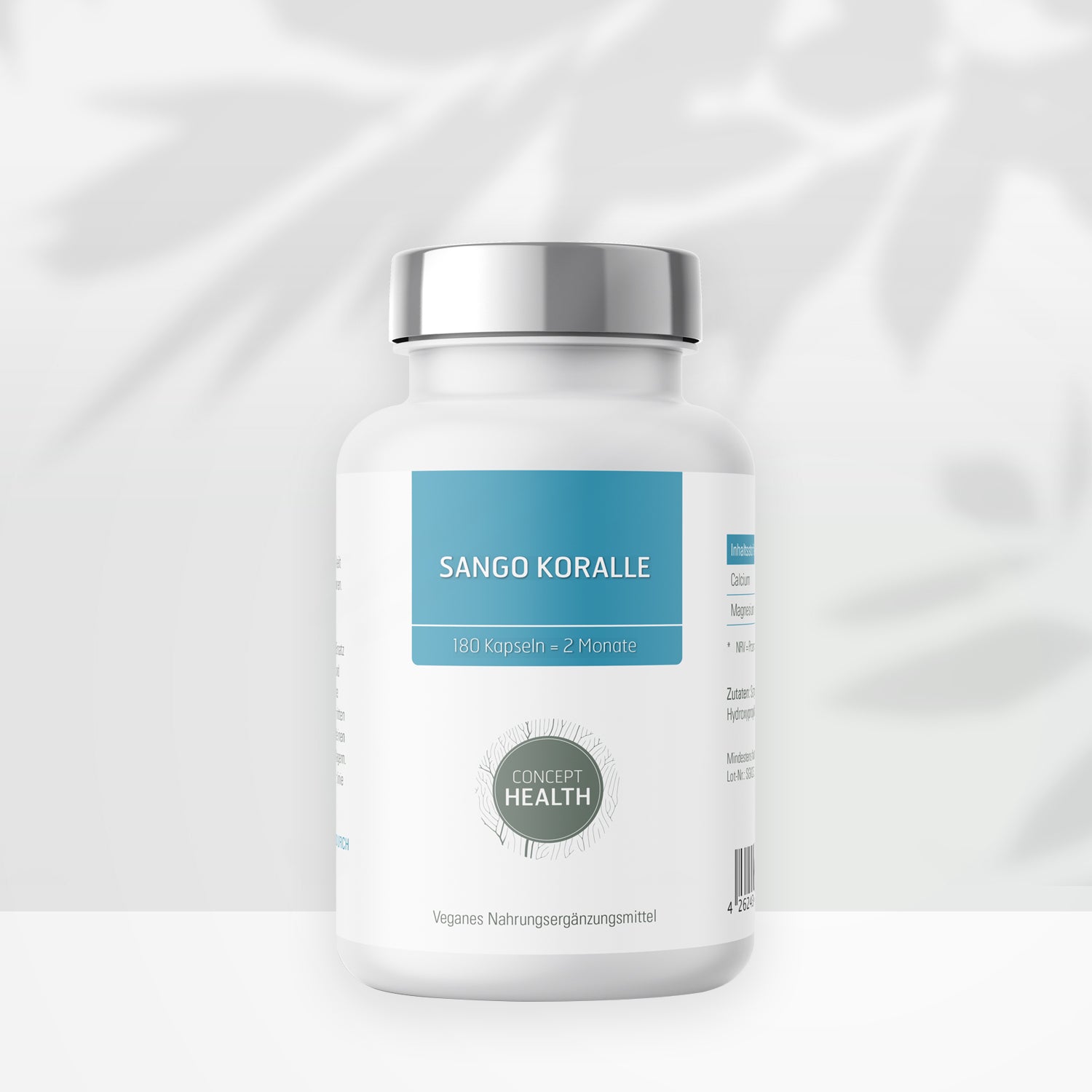 CONCEPT HEALTH Sango Koralle liefert einen hochwertigen Mineralstoffkomplex aus der Sango-Meereskoralle, die in klaren Gewässern rund um die japanische Insel Ōkinawa in nachhaltiger Weise gewonnen wird. Die einzigartige Zusammensetzung liefert Calcium und Magnesium im idealen Verhältnis von 2 : 1, ergänzt um mehr als 70 weitere Mineralstoffe und Spurenelemente. Ideal für alle, die ihre Mineralstoffversorgung optimieren möchten – insbesondere für Knochen, Zähne, Muskeln sowie das Säure-Basen-Gleichgewicht — vegan, natürlich und belastbar.