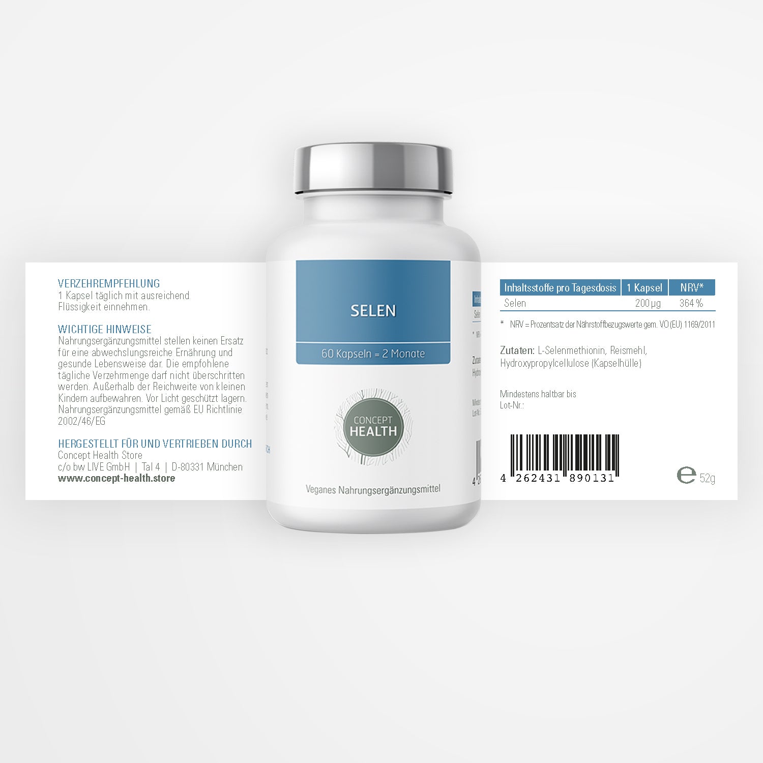 Das in CONCEPT HEALTH Selen verwendete Spurenelement stammt aus streng kontrollierten Quellen und wird in Österreich unter pharmazeutischen Bedingungen verarbeitet. Unsere Kapseln sind frei von synthetischen Zusatzstoffen, Gentechnik, Gluten und Laktose.