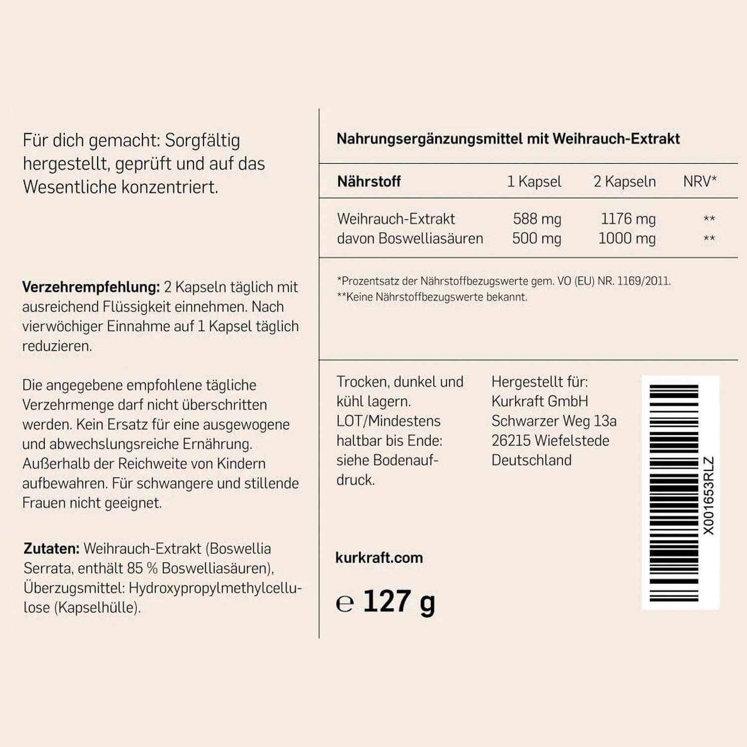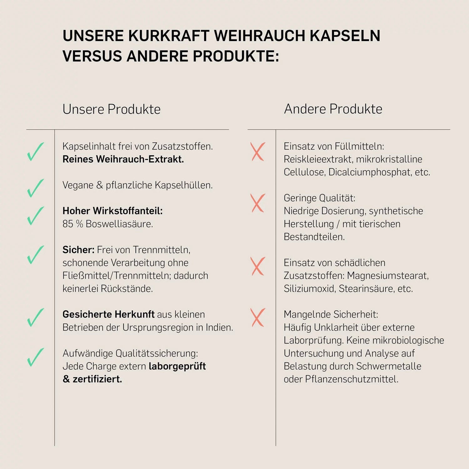Weihrauch von Kurkraft – das heilige Harz mit jahrtausendealter Tradition. In vielen Kulturen gilt es als Symbol für Reinigung, Stärke und innere Balance. Kurkraft Weihrauch Kapseln enthalten hochkonzentriertes Boswellia-serrata-Extrakt mit 85 % Boswelliasäuren und bieten eine natürliche Unterstützung für Wohlbefinden und Ausgeglichenheit. Das reine, pflanzliche Harzprodukt vereint Tradition mit moderner Qualitätsherstellung.